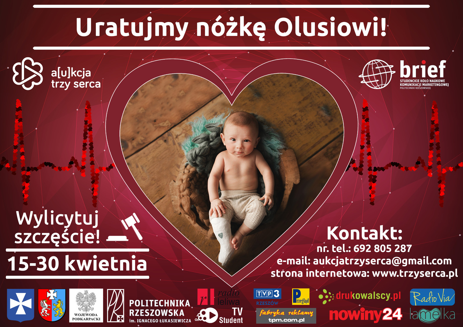 Od 15 do 30 kwietnia br. potrwa czwarta edycja akcji charytatywnej „A[u]kcja Trzy Serca”. W tym roku członkowie Studenckiego Koła Naukowego Komunikacji Marketingowej Brief, chcą pomóc ośmiomiesięcznemu Olkowi – chłopcu jednemu na milion.