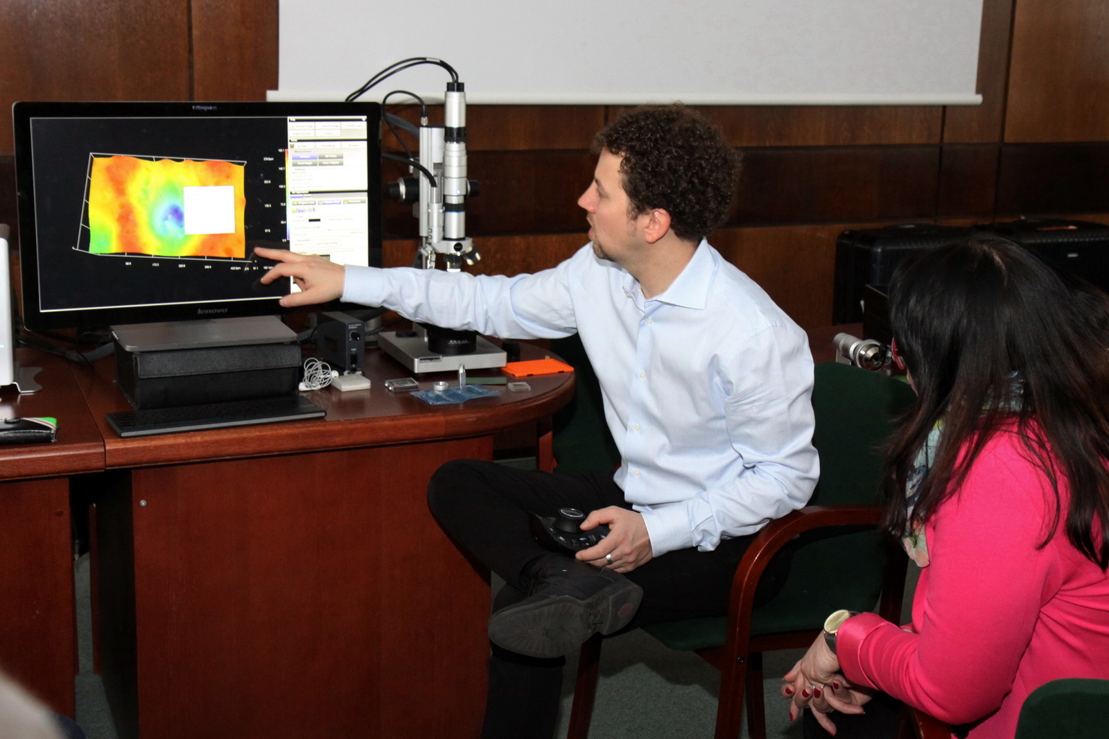 Spotkanie otworzył dr hab. inż. Jerzy Potencki, prof. PRz z Katedry Systemów Elektronicznych i Telekomunikacyjnych, zachęcając zebranych do wysłuchania i zapoznania się z możliwościami wielofunkcyjnego i najnowocześniejszego mikroskopu RH- 2000 3D Hirox. Prezentację poprowadzili Katarzyna Piekarska i Emilien Leonhardt z Hirox. Przybliżyli historię firmy oraz przedstawili zalety urządzenia: inspekcję na żywo zapisu filmów, tworzenie obrazu panoramicznego, kontrolę jakości, badanie powierzchni, dużą rozdzielczość. Mikroskop dokonuje m.in. pomiarów 2 i 3D oraz profilowania 3D, pomiaru powierzchni i objętości, łączenia obrazów 3D.