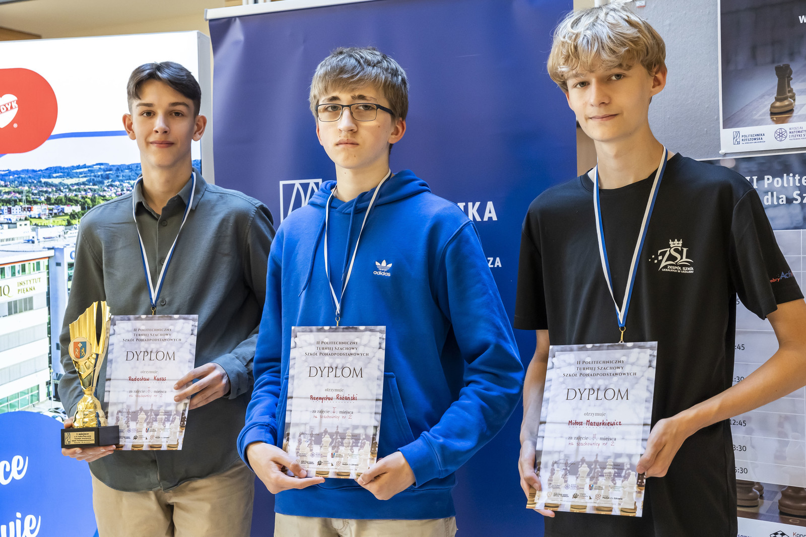 - szachownica nr 3: Maja Bauer z II Liceum Ogólnokształcącego w Rzeszowie, Mateusz Różycki z Zespołu Szkół Licealnych w Leżajsku, Gabriel Kasprzyk z Liceum Ogólnokształcącego Sióstr Prezentek w Rzeszowie,